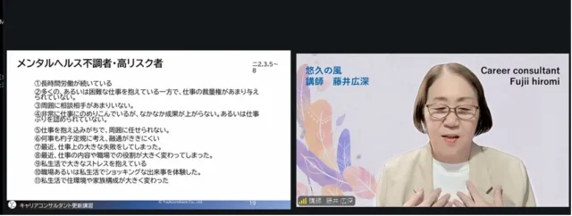 前半の講義では、メンタルヘルスケアとキャリアコンサルティングの違いについて、藤井講師ならではの丁寧で分かりやすい説明がありました。現場経験に基づいた具体的なお話も多く、メンタル不調のサインや、キャリアコンサルタントとして押さえておきたいポイントが自然と理解できました。また、不調を抱える相談者への関わり方についても、実践に活かせるヒントを多く学ぶことができました。